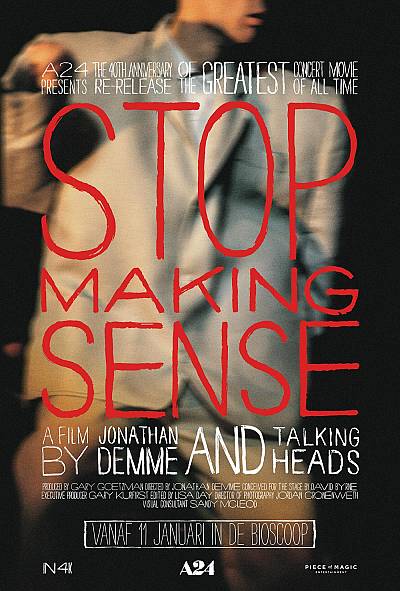 De beste concertfilm aller tijden! Gerenommeerd filmproducent A24 brengt met Stop Making Sense de Talking Heads terug naar het grote scherm. De film uit 1984 is gerestaureerd in 4K om het 40ste jubileumjaar te vieren en is vanaf 11 januari 2024 in de bioscoop te zien. Het energieke en inmiddels legendarische concert, destijds ter promotie van het nieuwe album Speaking in Tongues, werd geregisseerd door Jonathan Demme (The Silence of the Lambs). Het choreografisch strak geregisseerde optreden werd in december 1983 opgenomen in het Pantages Theater in Hollywood en laat de meest memorabele nummers van Talking Heads zien, zoals Burning Down The House, Psycho Killer,Once in a Lifetime, Slippery People en This Must be the Place. De film wordt gezien ais voorbeeld van vroege digitale audio technieken en in 2021 werd Stop Making Senseopgenomen in het United States National Film Registry zijnde "culturally, historically, or aesthetically significant”. Het absurd grote kostuum van David Byrne als hij Girlfriend Is Better zingt, werd een legendarisch fashion statement en beeldbepalend voor de film. In Stop Making Sense spelen de bandleden David Byrne, Tina Weymouth, Chris Frantz en Jerry Harrison samen met Bernie Worrell, Alex Weir, Steve Scales, Lynn Mabry en Edna Holt.